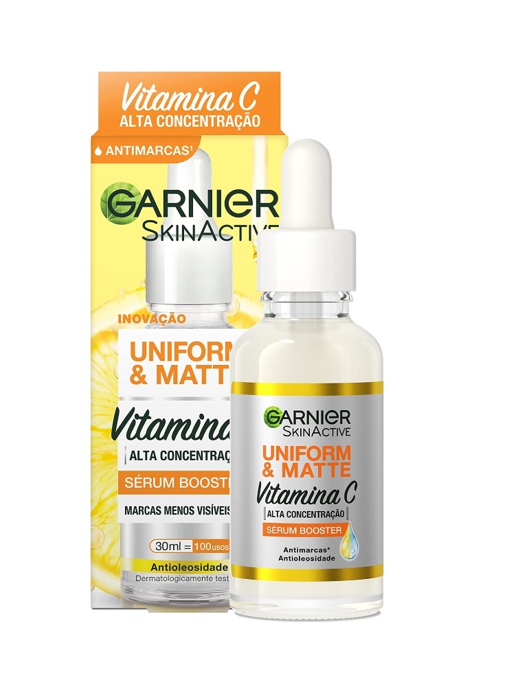 Sérum facial antimarcas. Garnier Uniform & Matte Vitamina C formulado para promover uma pele mais uniforme, hidratada e com menos marcas visíveis. Sua fórmula contém Vitamina C, um poderoso antioxidante que desempenha um papel fundamental na redução de manchas na pele.
