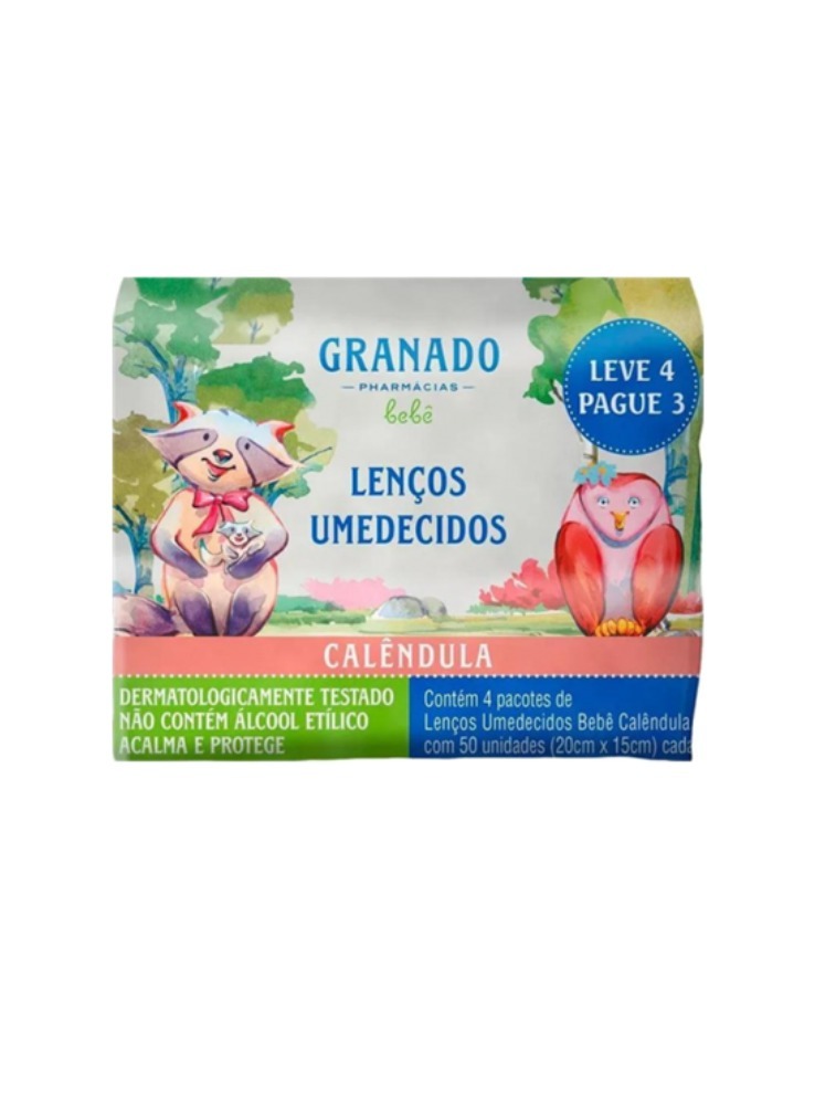 Kit 4 lenços umedecidos Granado Calêndula. É ideal para cuidar da pele sensível do bebê.