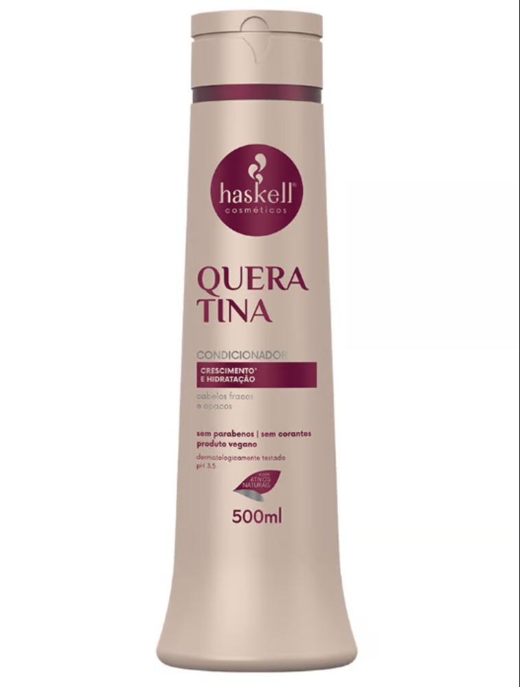 Modo de uso: Após lavar os cabelos com o shampoo Haskell Queratina, aplique o condicionador nos cabelos úmidos, massageando suavemente. Deixe agir por alguns minutos e enxágue completamente. Para melhores resultados, utilize regularmente.