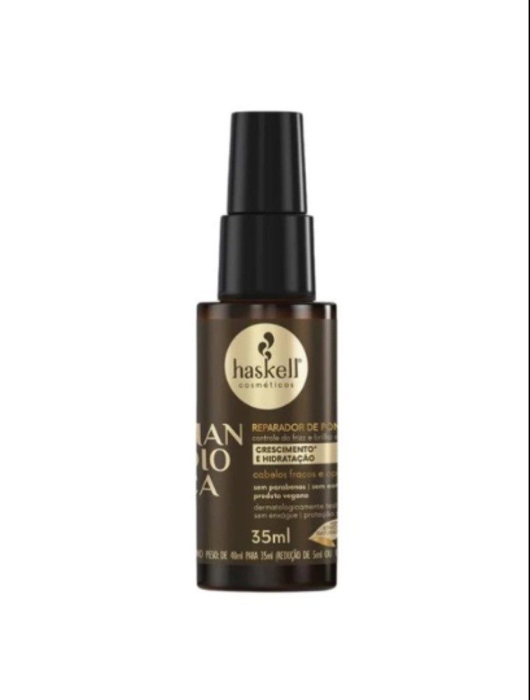 O Haskell Mandioca Reparador de Pontas é indicado para cabelos fracos e opacos. A sua fórmula previne as pontas duplas e controla o frizz, enquanto alinha as cutículas. Também é rica em vitaminas e nutrientes essenciais para um crescimento saudável. O seu cabelo fica mais brilhante e com um toque suave. Com proteção solar. Sem parabenos ou corantes.