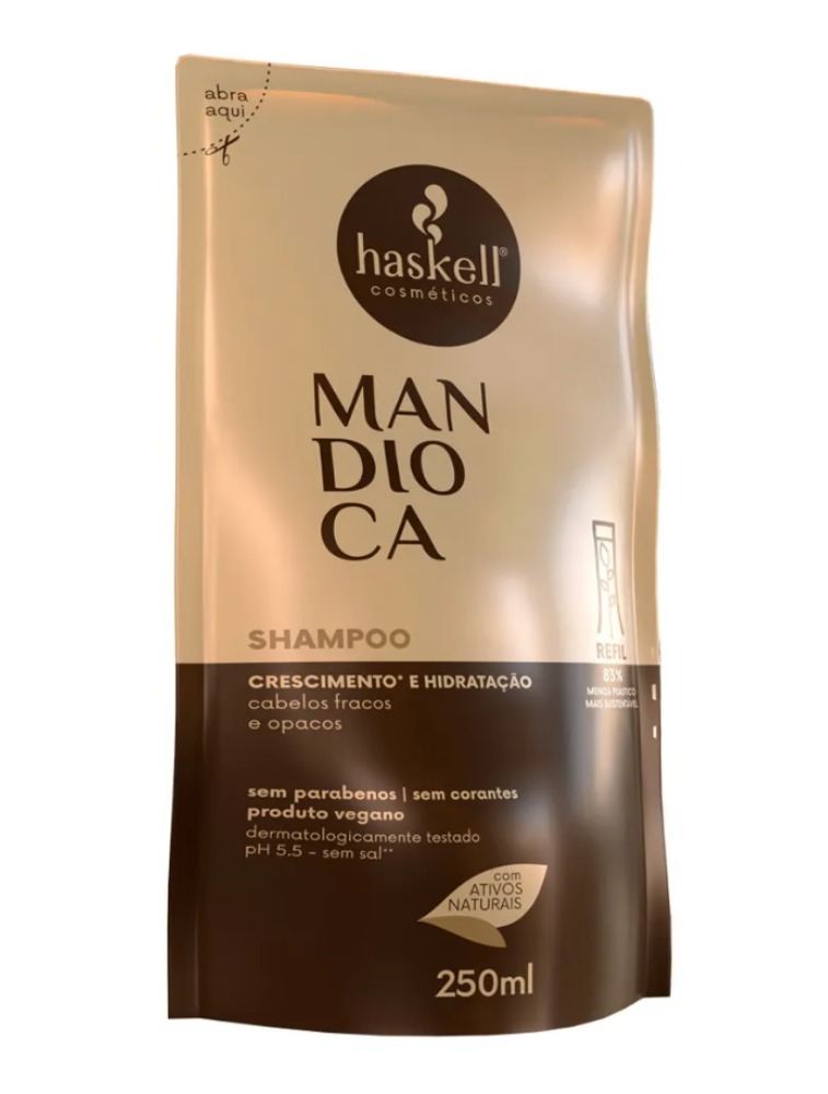 Desfrute dos benefícios da natureza para cabelos mais saudáveis, nutridos e radiantes com o Shampoo Haskell Mandioca.