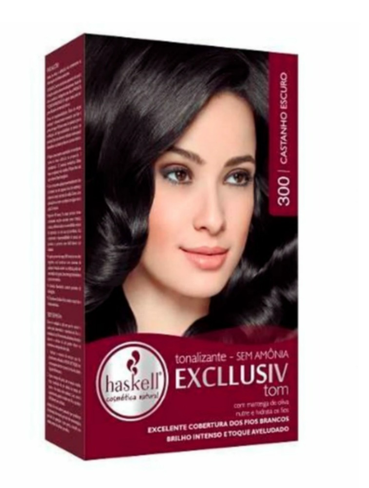 TONALIZANTE 300 CASTANHO ESCURO HASKELL CORES RICAS EM REFLEXOS NATURAIS E BRILHO INTENSO Fórmula SEM AM?-NIA que não agride os fios! O Tonalizante Excllusiv Tom Haskell colore os cabelos, promovendo brilho e cor intensa; Possui manteiga de oliva em sua composição, que penetra no interior da fibra capilar e proporciona hidratação e toque aveludado aos cabelos; Sua formulação permite que a cor se mantenha por mais tempo, além de prolongar a vivacidade do tom, promover excelente cobertura dos fios brancos e deixar os cabelos ainda mais bonitos e cheios de vida! TESTE DE MECHA: Separe uma mecha fina no alto da cabeça e prenda o restante do cabelo, para que não entrem em contato com a área do teste. Aplique o produto na mecha separada com o auxílio de um pente ou um pincel de plástico mantendo uma distância mínima de 1 centímetro da raiz. Deixe o produto agir de acordo com a tabela de tempo de ação. Caso ocorram danos, fragilização ou quebra dos fios, suspenda o uso imediatamente. TESTE DE ALERGIA: É absolutamente necessário que faça a prova de toque 48 horas antes da aplicação para a verificação de hipersensibilidade da pessoa ao produto. - Com um cotonete, aplique aproximadamente 1cm da mistura em um pequeno local do antebraço ou atrás da orelha. Deixe a área aplicada livre e retire o produto com água morna após 35 minutos. - Aguarde 48 horas. Se nesse período forem constadas reações anormais como irritação, coceira, ardência, inchaço, ou vermelhidão no local da aplicação ou em sua proximidade, fica comprovada a hipersensibilidade da pessoa ao produto, e, portanto, este NÃO deverá ser utilizado. - Se após a prova de toque (48horas) ou nos dias seguintes, você continuar com sintomas de qualquer irritação, coceiras ou ardência, pode ser uma reação mais grave. Lave com água abundante e procure um médico. MODO DE APLICAÇÃO EM CABELOS NATURAIS: - Molhe os cabelos, deixando-os úmidos, sem lavar. Retire o excesso de água com o auxílio de uma toalha. - Coloque o par de luvas de seu kit e comece a aplicação da mistura, mecha a mecha, desde a raiz até as pontas dos cabelos. - Massageie os cabelos até que a mistura esteja bem distribuída. Utilize toda a mistura para um bom resultado. Deixe agir por 35 minutos. Para maior cobertura dos fios brancos, deixe agir por mais 10 minutos. - Enxague os cabelos com água abundante, retirando todo o produto dos cabelos, até que a água fique sem cor. - Retire o excesso de água dos fios e aplique o Tratamento Excllusiv Trat pós coloração. Massageie e deixe agir por 3 minutos. Enxágue bem e finalize como desejar. MODO DE APLICAÇÃO EM CABELOS COLORIDOS: - Molhe os cabelos, deixando-os úmidos, sem lavar. Retire o excesso de água com o auxílio de uma toalha. - Coloque o par de luvas de seu kit e comece a aplicação da mistura, na raiz ou na parte crescida do cabelo. Deixe agir por 25 minutos. Caso tenha fios brancos, deixe agir por mais 10 minutos. - Em seguida, aplique o restante da mistura no comprimento e na ponta dos fios e massageie para garantir uma boa distribuição. Utilize toda a mistura para um bom resultado. Deixe agir por mais 15 minutos. - Enxague os cabelos com água abundante, retirando todo o produto dos cabelos, até que a água fique sem cor. - Retire o excesso de água dos fios e aplique o Tratamento Excllusiv Trat pós coloração. Massageie e deixe agir por 3 minutos. Enxágue bem e finalize como desejar.
