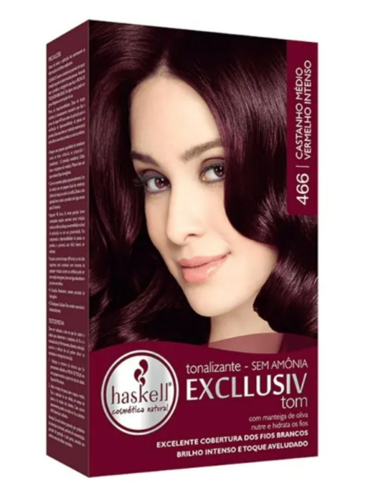 TONALIZANTE 466 CASTANHO MéDIO VERMELHO INTENSO HASKELL CORES RICAS EM REFLEXOS NATURAIS E BRILHO INTENSO Fórmula SEM AM?-NIA que não agride os fios! O Tonalizante Excllusiv Tom Haskell colore os cabelos, promovendo brilho e cor intensa; Possui manteiga de oliva em sua composição, que penetra no interior da fibra capilar e proporciona hidratação e toque aveludado aos cabelos; Sua formulação permite que a cor se mantenha por mais tempo, além de prolongar a vivacidade do tom, promover excelente cobertura dos fios brancos e deixar os cabelos ainda mais bonitos e cheios de vida! TESTE DE MECHA: Separe uma mecha fina no alto da cabeça e prenda o restante do cabelo, para que não entrem em contato com a área do teste. Aplique o produto na mecha separada com o auxílio de um pente ou um pincel de plástico mantendo uma distância mínima de 1 centímetro da raiz. Deixe o produto agir de acordo com a tabela de tempo de ação. Caso ocorram danos, fragilização ou quebra dos fios, suspenda o uso imediatamente. TESTE DE ALERGIA: É absolutamente necessário que faça a prova de toque 48 horas antes da aplicação para a verificação de hipersensibilidade da pessoa ao produto. - Com um cotonete, aplique aproximadamente 1cm da mistura em um pequeno local do antebraço ou atrás da orelha. Deixe a área aplicada livre e retire o produto com água morna após 35 minutos. - Aguarde 48 horas. Se nesse período forem constadas reações anormais como irritação, coceira, ardência, inchaço, ou vermelhidão no local da aplicação ou em sua proximidade, fica comprovada a hipersensibilidade da pessoa ao produto, e, portanto, este NÃO deverá ser utilizado. - Se após a prova de toque (48horas) ou nos dias seguintes, você continuar com sintomas de qualquer irritação, coceiras ou ardência, pode ser uma reação mais grave. Lave com água abundante e procure um médico. MODO DE APLICAÇÃO EM CABELOS NATURAIS: - Molhe os cabelos, deixando-os úmidos, sem lavar. Retire o excesso de água com o auxílio de uma toalha. - Coloque o par de luvas de seu kit e comece a aplicação da mistura, mecha a mecha, desde a raiz até as pontas dos cabelos. - Massageie os cabelos até que a mistura esteja bem distribuída. Utilize toda a mistura para um bom resultado. Deixe agir por 35 minutos. Para maior cobertura dos fios brancos, deixe agir por mais 10 minutos. - Enxague os cabelos com água abundante, retirando todo o produto dos cabelos, até que a água fique sem cor. - Retire o excesso de água dos fios e aplique o Tratamento Excllusiv Trat pós coloração. Massageie e deixe agir por 3 minutos. Enxágue bem e finalize como desejar. MODO DE APLICAÇÃO EM CABELOS COLORIDOS: - Molhe os cabelos, deixando-os úmidos, sem lavar. Retire o excesso de água com o auxílio de uma toalha. - Coloque o par de luvas de seu kit e comece a aplicação da mistura, na raiz ou na parte crescida do cabelo. Deixe agir por 25 minutos. Caso tenha fios brancos, deixe agir por mais 10 minutos. - Em seguida, aplique o restante da mistura no comprimento e na ponta dos fios e massageie para garantir uma boa distribuição. Utilize toda a mistura para um bom resultado. Deixe agir por mais 15 minutos. - Enxague os cabelos com água abundante, retirando todo o produto dos cabelos, até que a água fique sem cor. - Retire o excesso de água dos fios e aplique o Tratamento Excllusiv Trat pós coloração. Massageie e deixe agir por 3 minutos. Enxágue bem e finalize como desejar.