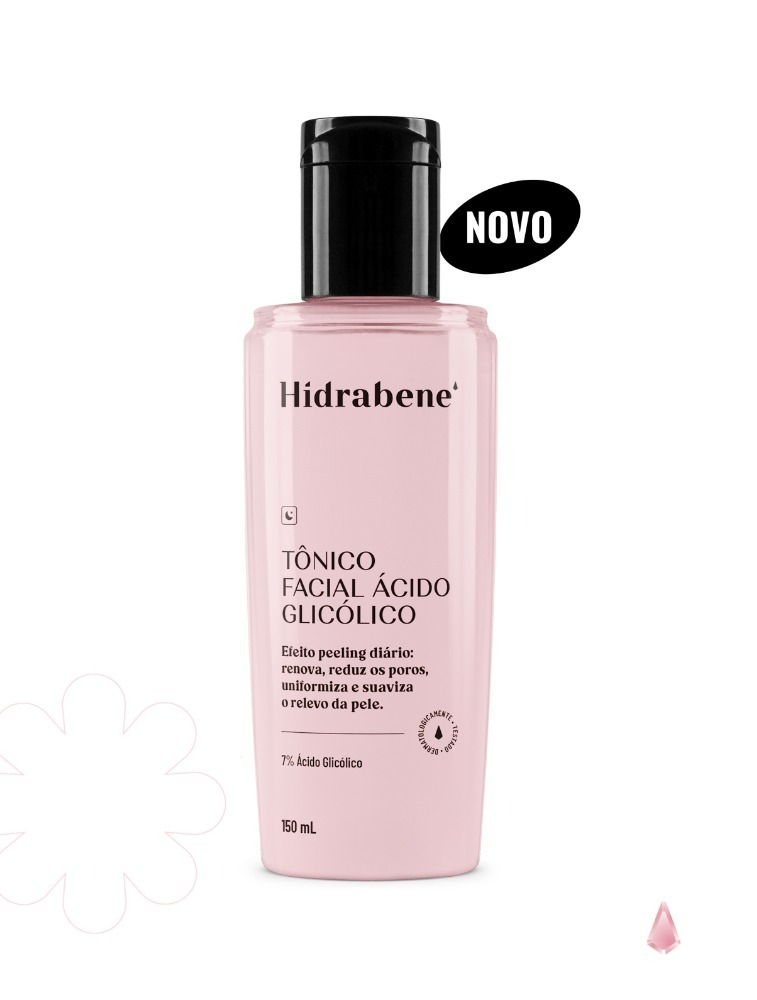 Hidrabene Tônico Facial Ácido Glicólico foi desenvolvido para proporcionar uma pele mais jovem, uniforme e com poros menos aparentes. Sua fórmula possui 7% de Ácido Glicólico, promovendo a renovação da pele, através da melhora da textura, estímulo de colágeno, desobstrução dos poros e controle da oleosidade. Produto clinicamente testado, não comedogênico, hipoalergênico, formulado de maneira a minimizar possível surgimento de alergia.
