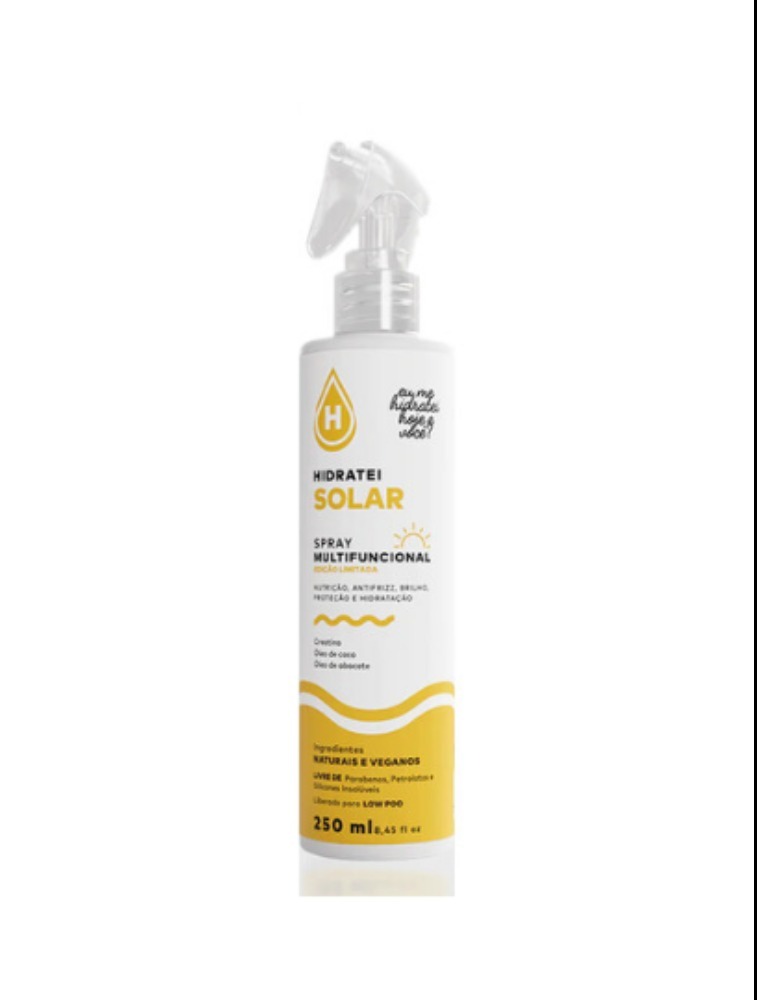 Spray Multifuncional Hidratei Solar. O produto conta com um filtro UV/UVB para proteger seu cabelo dos danos causados pelo sol e uma fragrância exclusiva que captura a essência do Verão. Um produto, múltiplos benefícios: alinhamento, proteção térmica, brilho, maciez e um irresistível aroma de Verão. Dê aos seus cabelos o cuidado que eles merecem!
