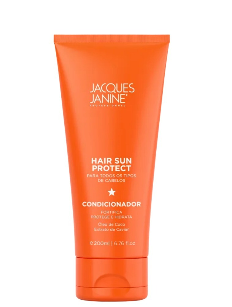 Condicionador para todos os tipos de cabelos. Jacques Janine Professionnel Hair Sun Protect evita o envelhecimento e fortifica os fios, além de entregar proteção contra os danos externos, como sol, cloro, poluição e sal.