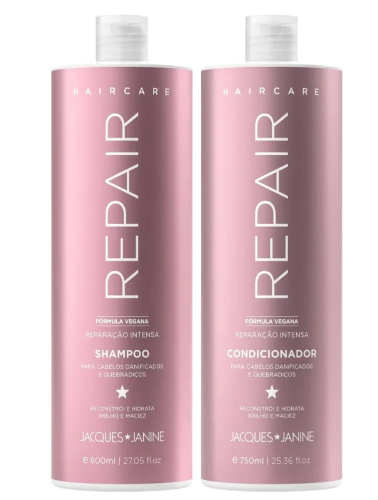 Kit com shampoo e condicionador para cabelos danificados. Jacques Janine Hair Care Repair promove madeixas saudáveis, fortes, iluminadas e ainda mais belas.