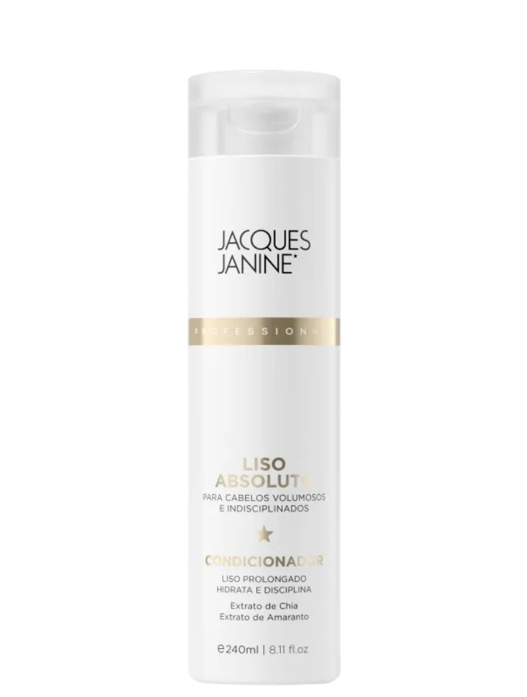 Condicionador para cabelos indisciplinados e com frizz. Condicionador Jacques Janine Liso Absoluto ajuda a controlar o volume, alinha e dá brilho. Perfeito para quem quer mais maciez e facilidade ao cuidar dos fios.