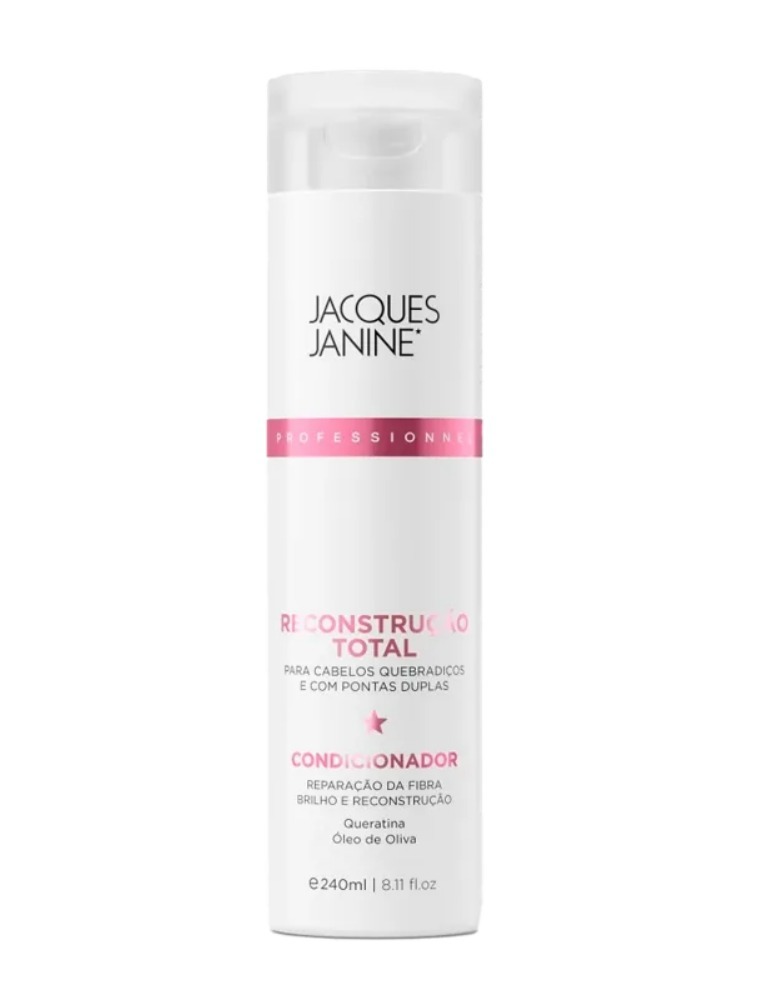 Condicionador Jacques Janine Professionnel Reconstrução Total age com a queratina para restaurar e fortalecer áreas fragilizadas ao mesmo tempo em que hidrata e sela as cutículas. Garante toque sedoso e mais brilho.