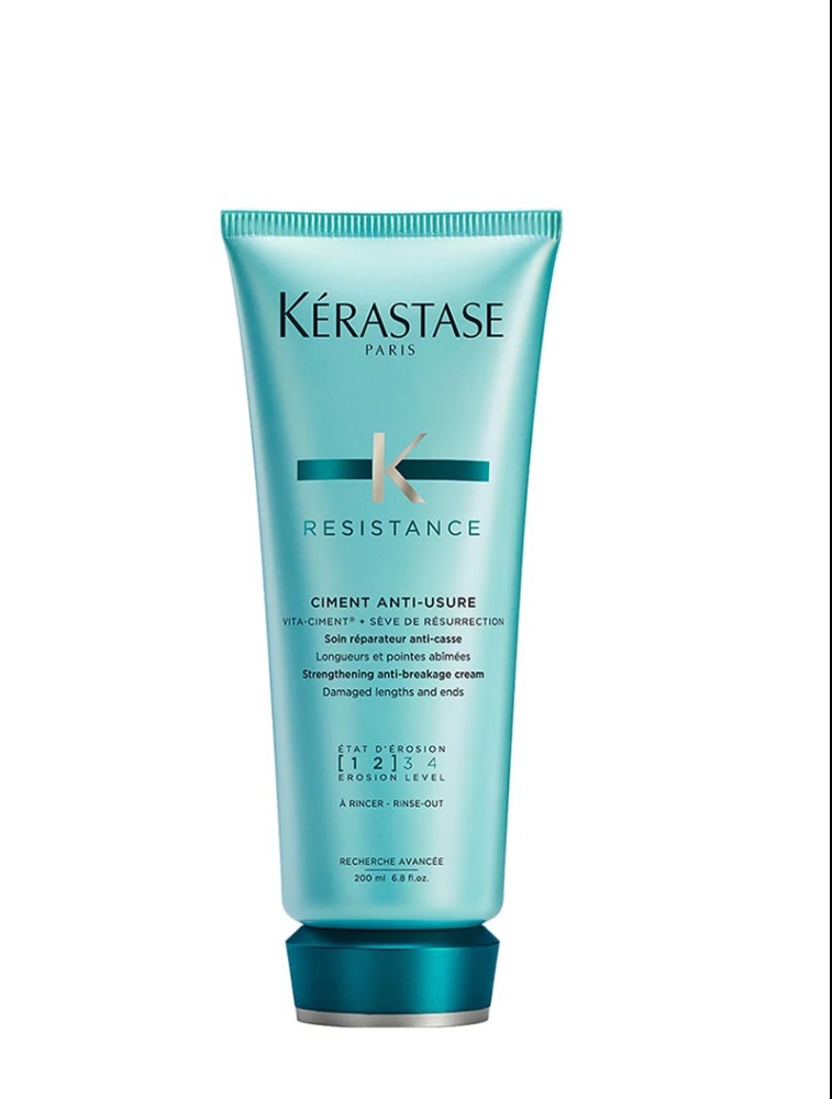 Condicionador de tratamento para cabelos danificados e finos. Kérastase Résistance Ciment Anti-Usure reconstrói profundamente e fortalece. Ele tem o poder de reduzir substancialmente a perda de matéria das fibras capilares causada por danos diários.