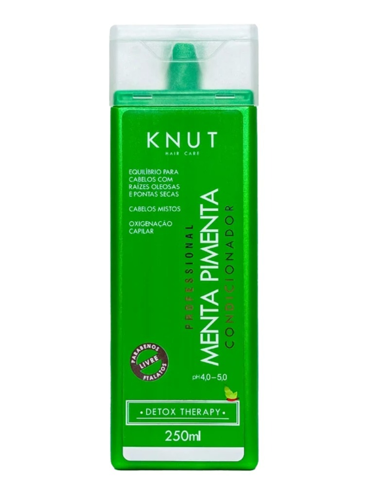 Condicionador para cabelos mistos, com raiz oleosa e pontas secas. Knut Menta Pimenta Condicionador promove equilíbrio e hidrata com leveza as áreas ressecadas.