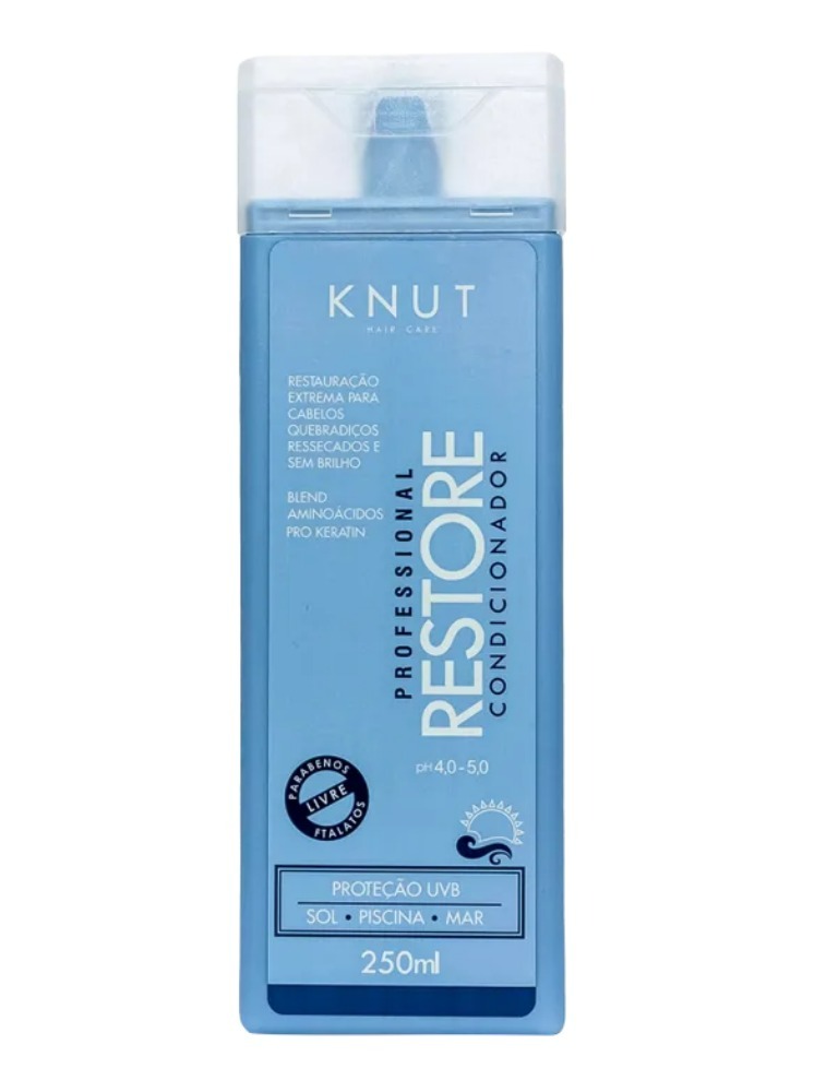 Knut Restore Condicionador ajuda a desembaraçar os fios e protege dos raios UVA/UVB durante a exposição em mar, piscina e sol. Deixa o cabelo mais resistente, recupera danos, sem fios quebradiços.