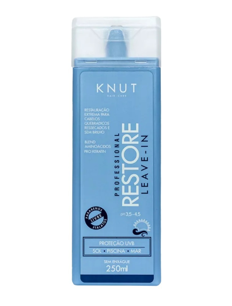 Leave-in para cabelos danificados ou ressecados, expostos ao mar, sol e piscina. Knut Restore Leave-in proteção UVA/UVB. Deixa os fios macios e brilhantes.