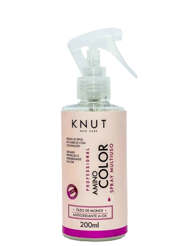 Leave-in multifuncional em spray para cabelos com coloração. Knut Amino Color Spray Multiuso protege a cor e proporciona brilho radiante.