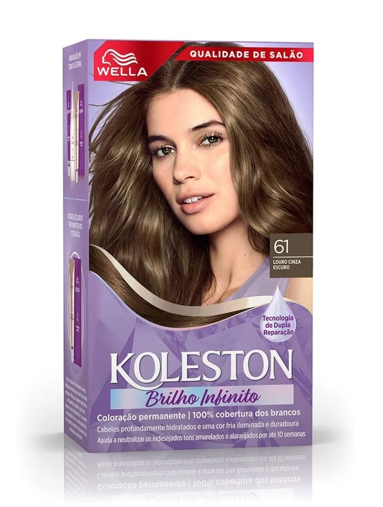 A Tinta de Cabelo Koleston Louro Cinza Escuro 61 é de fácil aplicação e cobre perfeitamente os fios brancos. Sua fórmula possui o exclusivo Tratamento Gloss Intenso que atua como uma barreira de proteção no cabelo para deixa-lo com mais brilho e maciez, ajudando a manter a intensidade da cor. Além disso, o kit conta também com o Reativador de Cor que deposita mais pigmentos no seu cabelo para ajudar a reaver a cor, depois de 15 dias da aplicação da tintura.
