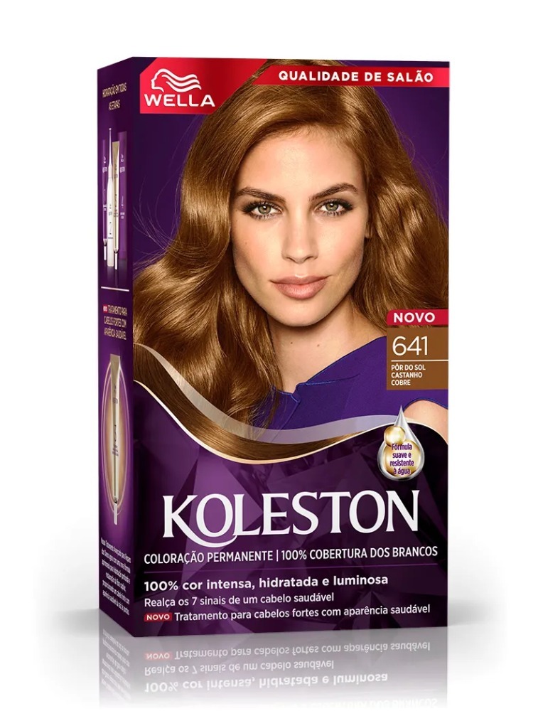 Tinta de Cabelo Koleston Pôr do Sol Castanho Cobre 641 se inspirou nos tons do pôr do sol ao amanhecer para desenvolver suas cores preferidas para Koleston. Sua fórmula possui o exclusivo Tratamento Gloss Intenso que atua como uma barreira de proteção no cabelo para deixa-lo com mais brilho e maciez, ajudando a manter a intensidade da cor. Além disso, o kit conta também com o Reativador de Cor que deposita mais pigmentos no seu cabelo para ajudar a reaver a cor, depois de 15 dias da aplicação da tintura.