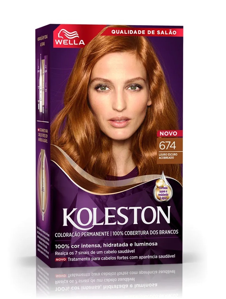 Desenvolvida para quem procura uma coloração permanente e de cor intensa e duradora, a Tinta de Cabelo Koleston Chocolate Acobreado 674, da Wella, oferece 100% da cobertura dos fios brancos, graças a tecnologia resistente à água. Seu exclusivo Tratamento Gloss Intenso deixa o cabelo com mais brilho, maciez e ajuda a manter a intensidade da cor. Além disso, o Kit Koleston vem com o Reativador de Cor que deposita mais pigmentos no seu cabelo para manter a cor mesmo depois de 15 dias. A tintura é de fácil aplicação e você pode tingir seus fios sozinha em casa.