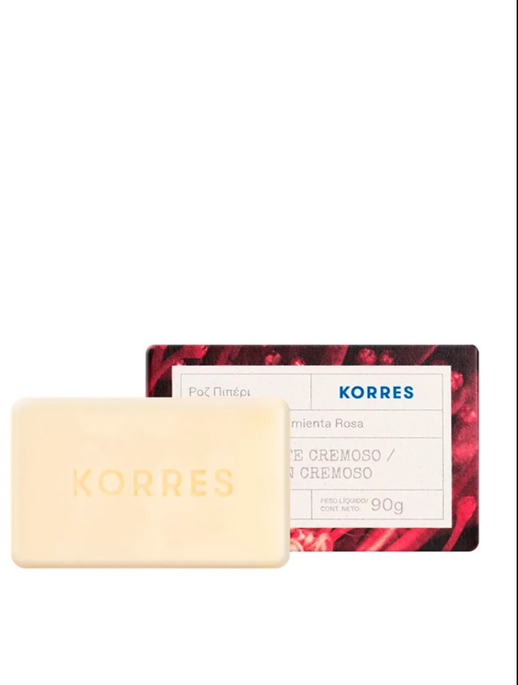 Sabonete em barra cremoso. Korres Pimenta Rosa limpa a pele com sua espuma cremosa e perfuma com fragrância sensual.