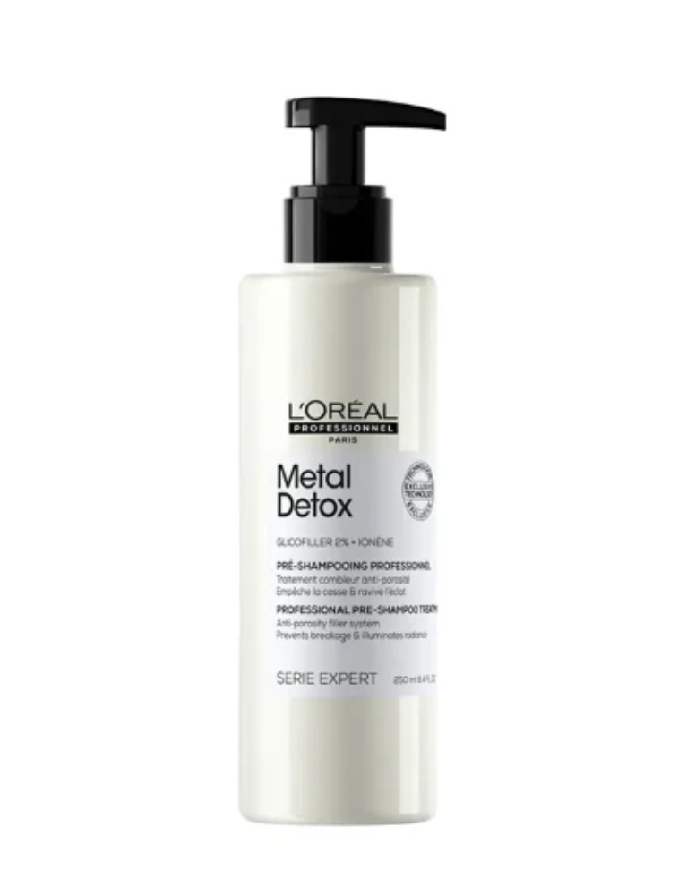 Pré-shampoo para todos os tipos de cabelos. L'Oréal Professionnel Metal Detox possui ação anti porosidade, fortalece a fibra e preenche microquebras