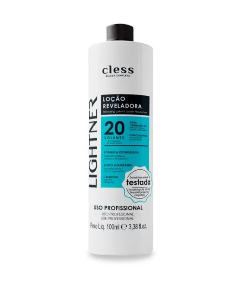 Lightner Água Oxigenada Cremosa Loção Reveladora com Camomila é indicada no processo de descoloração e na preparação de tinturas capilares. A camomila tem propriedades calmantes.