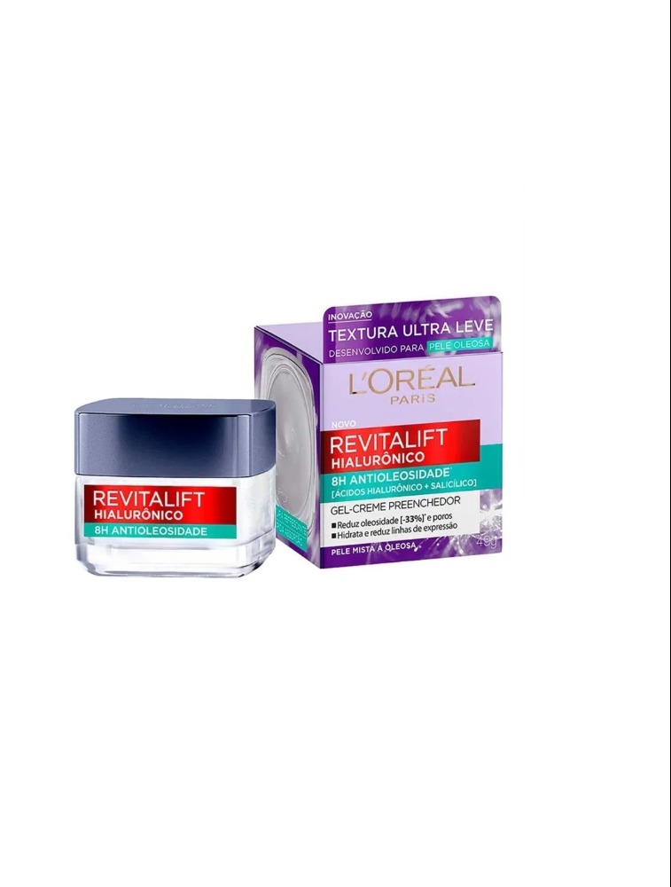 O Gel Creme Preenchedor Revitalift Hialurônico de L’Oréal Paris 8h Antioleosidade é um produto com fórmula ultraleve desenvolvida pelos laboratórios de L’ORÉAL para peles mistas a oleosas. Com dupla ação anti-idade + antioleosidade, preenche as linhas finas com hidratação e reduz visivelmente os poros, com 8H de controle de oleosidade. Testado por dermatologistas. Modo de Uso: Aplicar diariamente fazendo movimentos circulares ascendentes no rosto e pescoço previamente limpos.