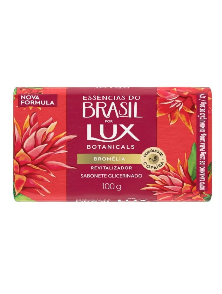 Conheça o Sabonete em Barra Essências do Brasil por Lux Botanicals Bromélia 100g, com poder revitalizador e formulado com ingredientes naturais, transformando seus banhos em puros momentos de prazer. Cada fragrância foi especialmente criada para revitalizar o seu corpo, mente e alma. A coleção, inspirada na exuberância da natureza do Brasil, foi baseada nos nossos rituais e tradições para transformar o seu momento de autocuidado em uma rotina de beleza diária. A fragrância da Bromélia, típica da Mata Atlântica, possui um acorde frutado fresco e fluido com notas cítricas. A fórmula do Sabonete em Barra Essências do Brasil por Lux Botanicals Bromélia contém óleo de copaíba, ingrediente com propriedades altamente hidratantes, além de conter glicerina para evitar o ressecamento da sua pele. Além disso, a marca possui outras opções de fragrâncias na linha: Flor do Cajueiro, Dama-da-Noite e Vitória-Régia. A coleção oferece formatos inéditos que trazem sensações e texturas únicas, assim uma nova garrafa transparente, moderna e sustentável, feita 100% de plástico reciclado e reciclável e com a opção de refil, com 70% menos plástico, para manter o planeta saudável. Transforme a sua experiência de banho em um momento único e prazeroso com os benefícios dos sabonetes Essências do Brasil por Lux Botanicals.