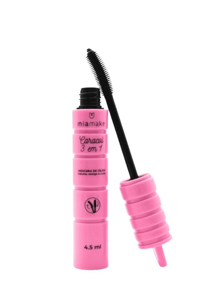 A máscara Caracol 3 em 1 da Mia Make vem com um pincel giratório inovador que facilita a aplicação e potencializa o efeito nos cílios, proporcionando um olhar impactante e definido.
