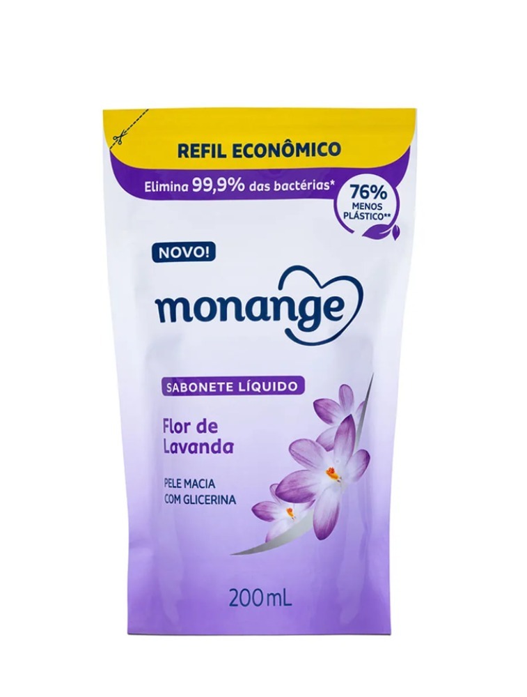 O Sabonete Líquido Refil Monange Flor de Lavanda agora possui 76% menos plástico em sua embalagem. Com aroma de lavanda, ele deixa a pele macia e perfumada, eliminando 99% das bactérias. Sua fórmula é composta por ingredientes naturais, biodegradáveis, sem corantes e livres de microplásticos. Indicado para todos os tipos de pele, é dermatologicamente testado e recomendado para uso corporal. Equilibre maciez e proteção na sua pele!