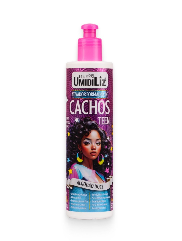 Modo de uso: Aplique o Ativador de Cachos Umidiliz Teen Algodão Doce nos cabelos úmidos, distribuindo uniformemente e amassando os cachos de baixo para cima. Não enxágue. Finalize como de costume e deixe secar naturalmente ou use um difusor.