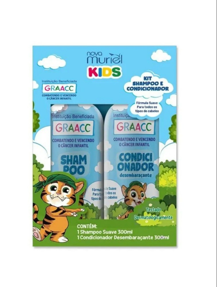 Muriel Kit Shampoo e Condicionador Graacc Azul 300ML Shampoo Graacc Muriel Kids Menino 300ml Oi mamãe. Desenvolvemos uma formulação suave e ao mesmo tempo muito eficiente para você deixar os cabelinhos do seu filhinho uma graça. Sabemos que você quer ver os cabelinhos do seu anjinho lindos, limpos e com aquele cheirinho que só a linha Kids Graacc tem e o primeiro passo para alcançar esse resultado é só usar o Shampoo Kids Graacc. É sempre bom lembrar que o Shampoo Kids Graacc é dermatologicamente testado Você vai adorar o resultado. Modo de usar: Com os cabelinhos molhados, aplique o Shampoo Kids Graacc massageando com cuidado o couro cabeludo utilizando a ponta dos dedos. Enxágue e repita a aplicação. Enxágue novamente e pronto: os cabelinhos do seu filhinho estão prontos para receber o Condicionador Kids Graacc. Cuidados: Deve ser aplicado por adulto ou sob sua supervisão. Não usar se o couro cabeludo estiver ferido ou irritado. Em caso de irritação, suspender o uso e procurar um médico. Manter ao abrigo da luz solar ou calor. Condicionador Graacc Muriel Kids Menino 300ml O Condicionador Kids Graacc foi desenvolvido para desembaraçar e deixar os cabelinhos do seu filhinho macios e brilhantes, o Condicionador Kids Graacc deve ser aplicado logo após o uso do Shampoo Kids Graacc. Com fórmula moderna, suave e eficiente, o Condicionador Kids Graacc deixará os cabelinhos do seu anjinho soltos, com penteabilidade e aquele cheirinho que só a linha Kids Graacc tem. Faça tudo isso com tranquilidade pois o Condicionador Kids Graacc é dermatologicamente testado. Modo de usar: Após lavar os cabelinhos do seu filhinho com o Shampoo Kids Graacc aplique o Condicionador Kids Graacc neles ainda molhados, massageando-os desde a raiz até as pontas. Espere dois minutinhos antes de enxaguar para que os cabelinhos do seu anjinho possam absorver os nutrientes presentes nesta formulação. Após o enxágue, retire o excesso de água, mantendo os cabelinhos úmidos e prontos para receber o Creme para Pentear Kids Graacc Cuidados: Evitar contato com os olhos. Deve ser aplicado por adulto ou sob sua supervisão.
