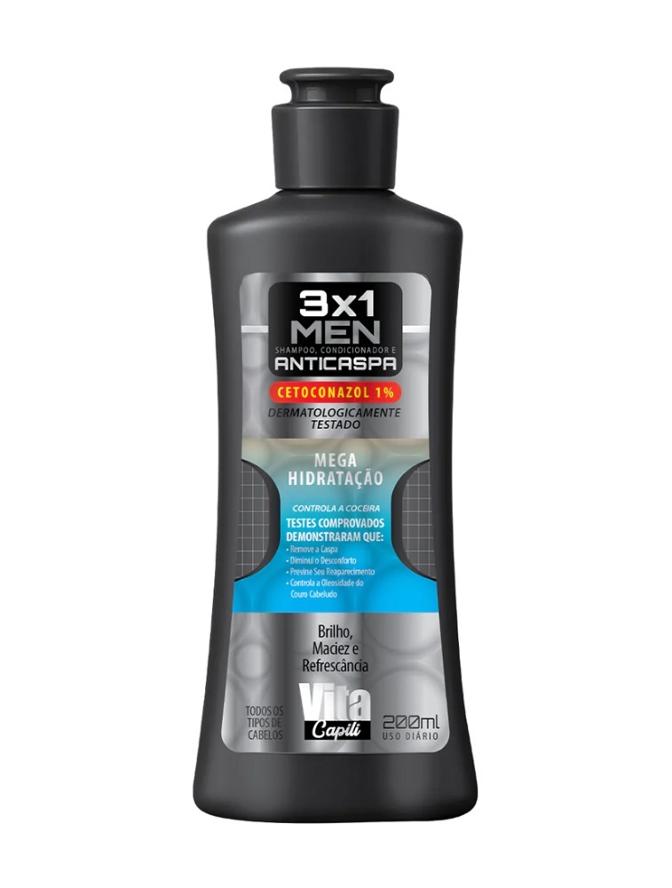 O Shampoo e Condicionador Vita Capili Men 3×1 + Anticaspa Tradicional foi desenvolvido para oferecer limpeza eficaz, condicionamento e ação anticaspa em um único produto prático. Sua fórmula contém CETOCONAZOL 1%, ativo potente no combate à caspa, além de ingredientes que controlam a oleosidade e aliviam o desconforto do couro cabeludo.