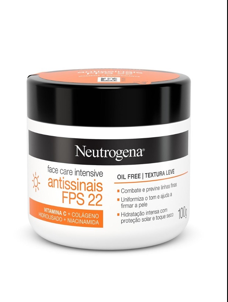 Hidratante Facial Antissinais NEUTROGENA® Face Care Intensive FPS 22 tem ação eficaz contra os três principais fatores de envelhecimento da pele: combate e previne linhas finas, além de uniformizar o tom e ajudar a firmar a pele. Proporciona hidratação intensa com proteção solar contra raios UVA e UVB combinado à sua textura leve, oil free e de fácil absorção, deixando toque seco na pele. Combina 3 ingredientes dermatologicamente comprovados em um só produto: vitamina C antioxidante, colágeno, niacinamida. Fórmula avançada que oferece mais ciência para sua pele.
