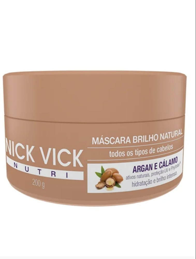A Linha Brilho Natural Nick Vick contém formulação enriquecida com Argan e Cálamo que selam os fios e promovem brilho intenso.