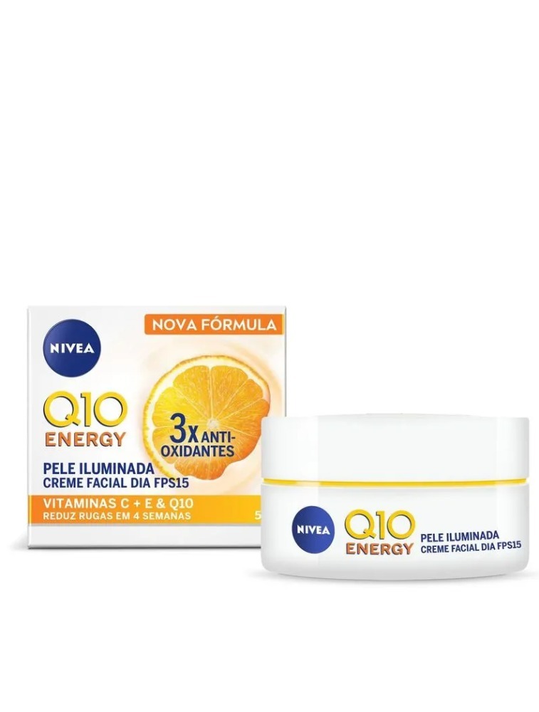 NIVEA Creme Facial Antissinais Q10 Energy Dia FPS 15 é um creme facial que reduz as rugas em 4 semanas, deixando a pele mais firme.