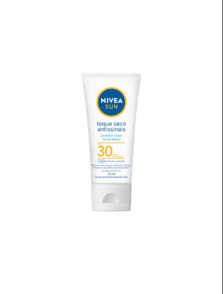 Protetor solar facial NIVEA SUN Toque Seco Antissinais com textura leve e toque seco. Deixa a pele macia e ainda previne o envelhecimento.
