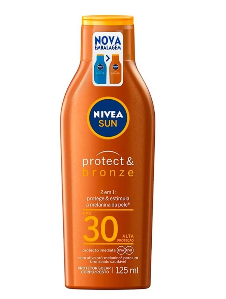 Bronzeador e protetor solar corporal que protege a pele dos raios solares e deixa a pele bronzeada. Confira +detalhes! Para que serve o Protetor Solar Nivea Protect & Bronze? A combinação de Betacaroteno e Ácido Glicirretínico em sua fórmula ativa a melanina e estimula o bronzeado natural da pele. Benefícios e diferenciais - Ajuda a manter a cor bonita e uniforme por mais tempo - FPS 30 protege dos raios UVA/UVB - Resistente à água - Previne o envelhecimento da pele Como usar o Protetor Solar Nivea Protect & Bronze? Aplique uma boa quantidade na pele seca, 15 minutos antes de sair ao sol. Para manter a proteção, reaplique o produto sempre que achar necessário. Uma unidade de embalagem contém 125ml