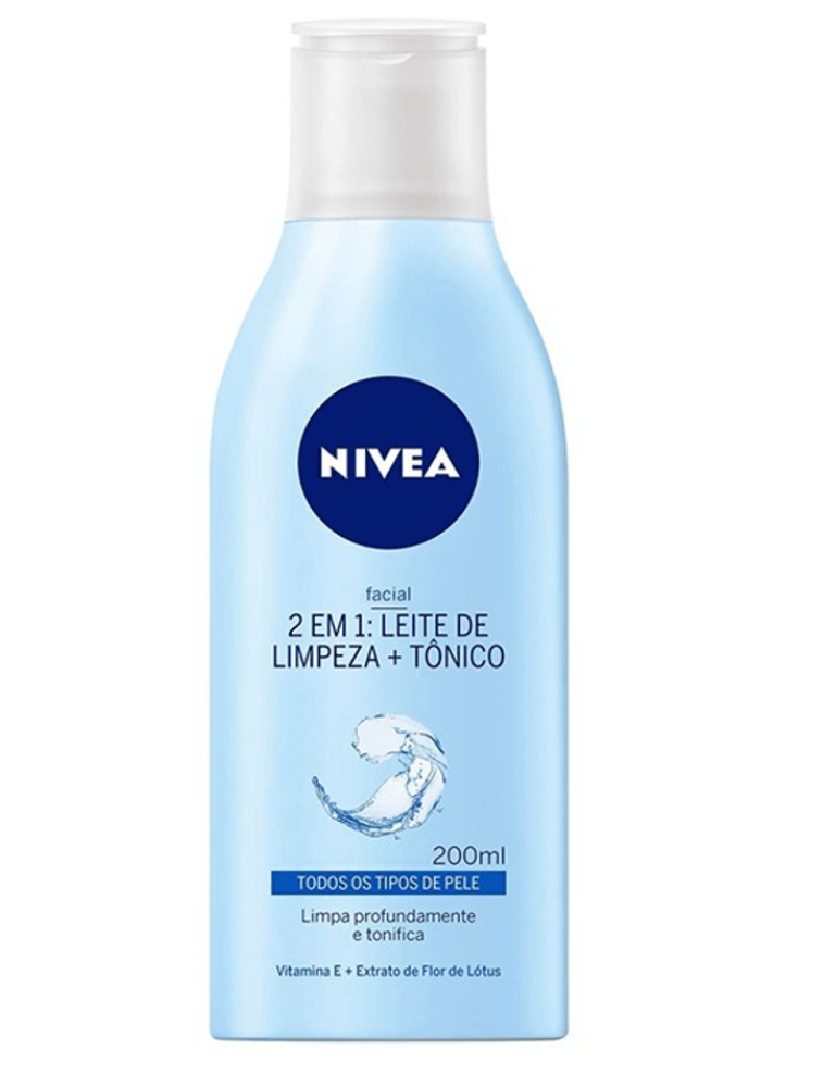 NIVEA Loção 2 em 1 - Leite de Limpeza e Tônico é um produto de limpeza facial que combina leite de limpeza e tônico em um só. Para que serve? Dermatologicamente testado, este produto oferece uma limpeza profunda, removendo resíduos de poluição e deixando a pele revitalizada. Sua fórmula exclusiva remove efetivamente tanto as impurezas, quanto os resíduos de maquiagem, deixando a pele limpa e fresca. Indicado para todos os tipos de pele, este produto é enriquecido com Vitamina E, um poderoso antioxidante, e Vitamina B5, que renova a pele e desobstrui os poros, sem deixar a sensação oleosa. Benefícios e diferenciais: - Limpa e tonifica profundamente, desobstruindo os poros - Remove impurezas, inclusive resíduos de maquiagem e poluição - Contém vitamina E, antioxidante para uma pele mais saudável e bem cuidada - Contém vitamina B5, que auxilia na renovação da pele - Dermatologicamente testado.