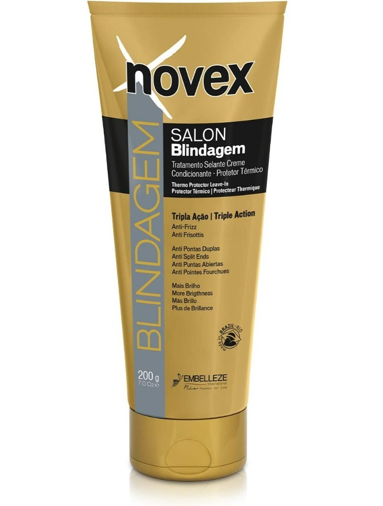 Novex Salon Blindagem Capilar é um creme condicionante que forma uma barreira protetora que minimiza os danos aos fios.