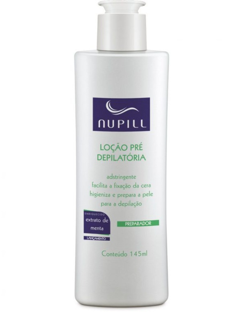 A loção pré-depilatória NUPILL adstringente limpa e prepara a pele para uma perfeita depilação, remove impurezas e oleosidade da pele, aumentando a eficiência da depilação. Utilize sempre antes de se depilar seja com lâminas, cera ou creme depilatório.
