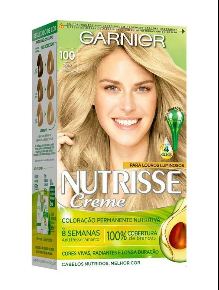 Garnier Nutrisse Creme 100 LOURO SOL é a coloração permanente que garante cores vivas, radiantes e de longa duração. Para louros luminosos, é a única com Blindagem Nutritiva, que fixa a cor profundamente e por mais tempo. Sua Gota Poderosa é enriquecida com óleos de frutas, proporcionando mais nutrição e um tratamento rico em vitaminas com ação anti ressecamento por até 8 semanas! Sua textura cremosa e aveludada é de fácil aplicação e não escorre, garantindo cobertura perfeita de cada fio. Experimente e surpreenda-se... Cabelos nutridos, melhor cor! Até 8 semanas anti ressecamento 100% de cobertura dos fios brancos Cores vivas e radiantes por mais tempo Cabelos nutridos, macios e brilhantes A nova fórmula de Garnier Nutrisse une alta tecnologia com ingredientes naturais, que te ajudarão a conquistar em casa até as cores mais cobiçadas e difíceis. O benefício? Age protegendo a fibra capilar do ressecamento, garantindo uma reconstrução total dos fios e um resultado de cor muito mais intenso. Kit com 4 super óleos: abacate, oliva, cassis e semente de uva. Sua cor garantida com 100% de cobertura dos fios brancos e cabelos macios, brilhantes e com delicioso perfume de frutas! Composição: 1 Tubo Máscara Colorante 45g 1 Frasco Aplicador Revelador 67,5ml 1 Sachet de tratamento blindagem 20ml 1 Cápsula concentrada nutritiva 4,5ml 1 Par de luvas 1 Folheto explicativo Precauções: Este produto não é destinado a menores de 16 anos. Os colorantes capilares podem provocar reações alérgicas. O teste de alergia deve ser feito 48 horas antes do uso. Sempre leia as instruções de segurança antes de utilizar o produto e siga-as cuidadosamente. Se seus cabelos são longos ou volumosos, use 2 kits para a primeira aplicação. Modo de Usar: 1- Coloque todo o conteúdo Gota Poderosa com Concentrado Nutritivo de Óleo de Fruta e do tubo de Máscara Colorante dentro do Frasco Aplicador. Feche e agite bem até obter uma mistura homogênea. 2- Aplique a mistura sobre os cabelos secos, iniciando pela raiz e indo até as pontas. Deixe agir por 40 minutos e, se seus cabelos são muito brancos ou difíceis de absorver a tintura, deixe agir por mais 5 minutos. 3- Enxágue os cabelos com bastante água até que a tintura seja totalmente eliminada. 4- Coloque todo o conteúdo de 01 sachê de tratamento Blindagem Nutritiva sobre os cabelos. 5- Após uma semana de realizar a coloração, aplique todo o conteúdo do segundo sachê de tratamento Blindagem Nutritiva após lavar os cabelos.
