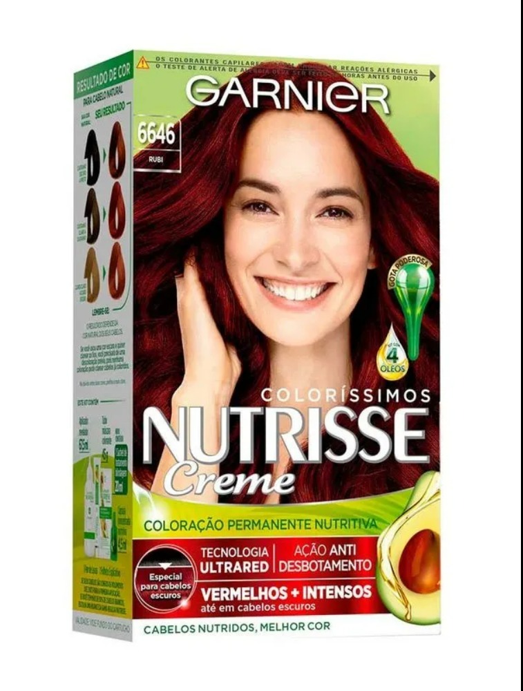 Garnier Nutrisse Creme 6646 RUBI é a coloração permanente que garante cores vivas, radiantes e de longa duração. Para vermelhos intensos, é a única com Blindagem Nutritiva, que fixa a cor profundamente e por mais tempo. Sua Gota Poderosa é enriquecida com óleos de frutas, proporcionando mais nutrição e um tratamento rico em vitaminas com ação anti ressecamento por até 8 semanas! Sua textura cremosa e aveludada é de fácil aplicação e não escorre, garantindo cobertura perfeita de cada fio. Experimente e surpreenda-se... Cabelos nutridos, melhor cor! Até 8 semanas anti ressecamento 100% de cobertura dos fios brancos Cores vivas e radiantes por mais tempo Cabelos nutridos, macios e brilhantes A nova fórmula de Garnier Nutrisse une alta tecnologia com ingredientes naturais, que te ajudarão a conquistar em casa até as cores mais cobiçadas e difíceis. O benefício? Age protegendo a fibra capilar do ressecamento, garantindo uma reconstrução total dos fios e um resultado de cor muito mais intenso. Kit com 4 super óleos: abacate, oliva, cassis e semente de uva. Sua cor garantida com 100% de cobertura dos fios brancos e cabelos macios, brilhantes e com delicioso perfume de frutas! Composição: 1 Tubo Máscara Colorante 45g 1 Frasco Aplicador Revelador 67,5ml 1 Sachet de tratamento blindagem 20ml 1 Cápsula concentrada nutritiva 4,5ml 1 Par de luvas 1 Folheto explicativo Precauções: Este produto não é destinado a menores de 16 anos. Os colorantes capilares podem provocar reações alérgicas. O teste de alergia deve ser feito 48 horas antes do uso. Sempre leia as instruções de segurança antes de utilizar o produto e siga-as cuidadosamente. Se seus cabelos são longos ou volumosos, use 2 kits para a primeira aplicação. Modo de Usar: 1- Coloque todo o conteúdo Gota Poderosa com Concentrado Nutritivo de Óleo de Fruta e do tubo de Máscara Colorante dentro do Frasco Aplicador. Feche e agite bem até obter uma mistura homogênea. 2- Aplique a mistura sobre os cabelos secos, iniciando pela raiz e indo até as pontas. Deixe agir por 40 minutos e, se seus cabelos são muito brancos ou difíceis de absorver a tintura, deixe agir por mais 5 minutos. 3- Enxágue os cabelos com bastante água até que a tintura seja totalmente eliminada. 4- Coloque todo o conteúdo de 01 sachê de tratamento Blindagem Nutritiva sobre os cabelos. 5- Após uma semana de realizar a coloração, aplique todo o conteúdo do segundo sachê de tratamento Blindagem Nutritiva após lavar os cabelos.