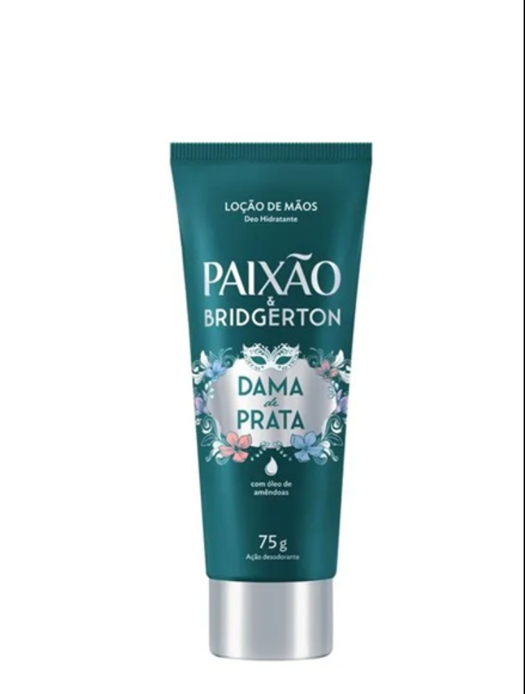 A Loção Hidratante de Mãos Paixão & Bridgerton Dama de Prata com Ação Desodorante 75g é enriquecida com o nobre óleo de amêndoas e hidrata por até 48h.