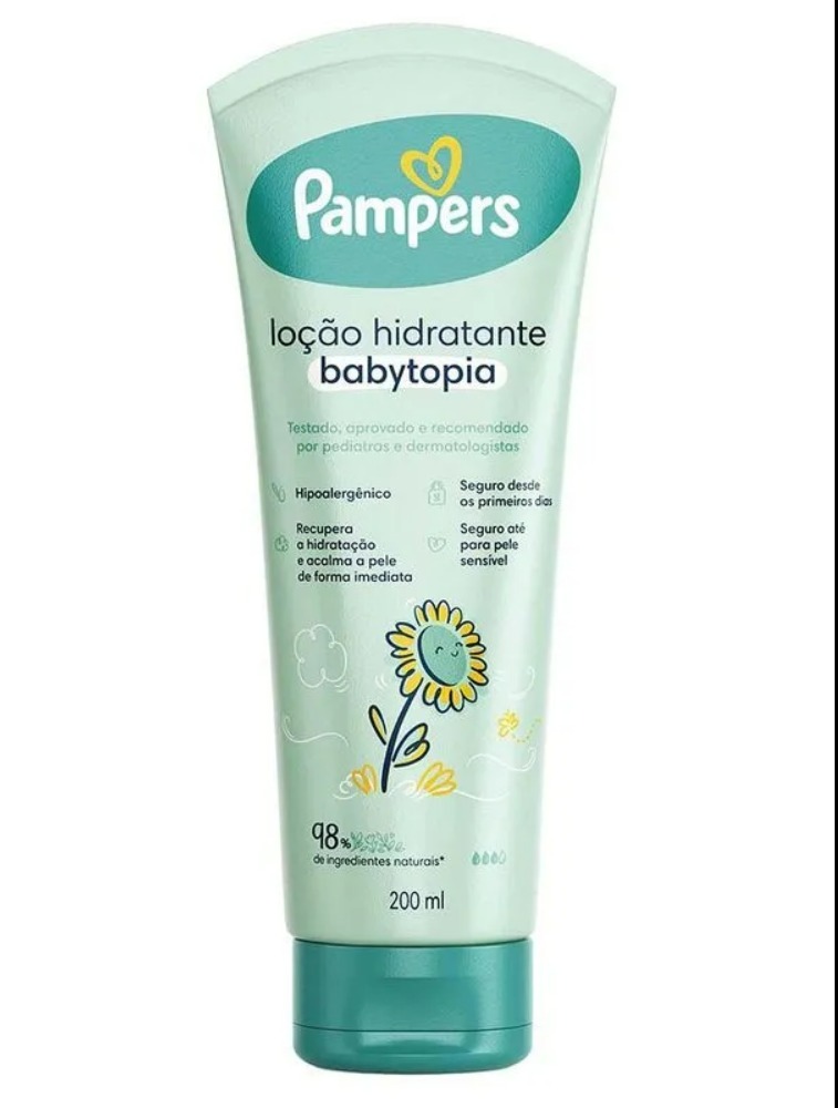 Loção Babytopia hidrata e acalma o desconforto, como coceira da pele sensível pelo ressecamento. A Loção Babytopia Pampers foi criada pensando em hidratar e acalmar o desconforto, como coceira, da pele sensível pelo ressecamento. Sua composição não contém nenhum álcool etílico, fenoxietanol, parabenos e corantes, trazendo maior suavidade e mantendo a pele do seu neném macia. Testado, aprovado e recomendado por pediatras e dermatologistas, a Loção Hidratante Babytopia Pampers é segura até para a pele sensível. Benefícios: Seguro até para pele sensível. Seguro desde os primeiros dias. Recupera a hidratação e acalma a pele de forma imediata. Hipoalergênico. 98% de ingredientes naturais. Ajuda a minimizar os desconfortos da pele ressecada/sensível do bebê. Recupera a barreira da pele sensível do bebê. Textura densa. pH ideal para a pele do bebê. Sem fragrância. Fórmula vegana e livre de crueldade animal. Com óleo de girassol. Para todos os tipos de pele, seguro até para pele sensível Modo de Uso: Com a pele limpa e seca, coloque um pouco do hidratante em uma das mãos e espalhe em todo o corpinho do seu bebê, até a absorção. Não é necessário enxágue. Orientações ao Consumidor: Este produto foi formulado de maneira a minimizar possível surgimento de alergia. Deve ser aplicado por adulto ou sob sua supervisão. Não usar na pele irritada ou ferida. Em caso de irritação suspender o uso e procurar um médico.