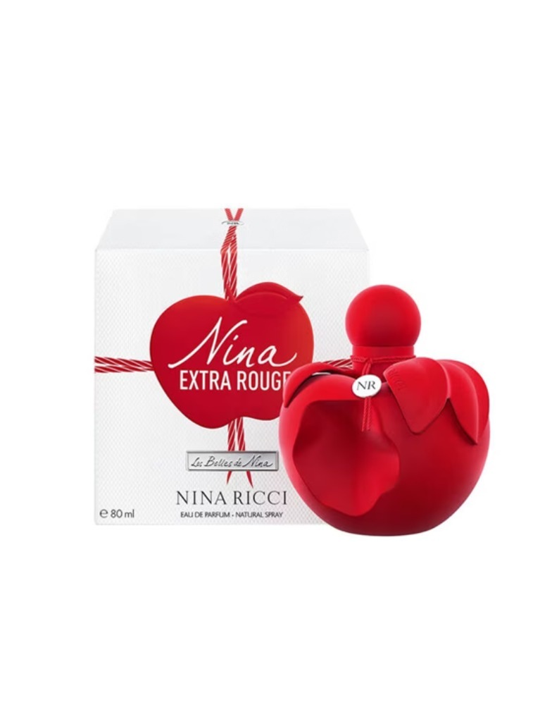 A maçã icônica de cor vermelha, o frasco do perfume Nina é um emblema reconhecido no mundo inteiro. Para Nina Extra Rouge, ele surge totalmente revestido de um vermelho intenso com acabamento mate, com textura de veludo. Uma maçã tão tentadora que já foi até mordida. Sob a cobertura de vermelho, ainda mais vermelho!