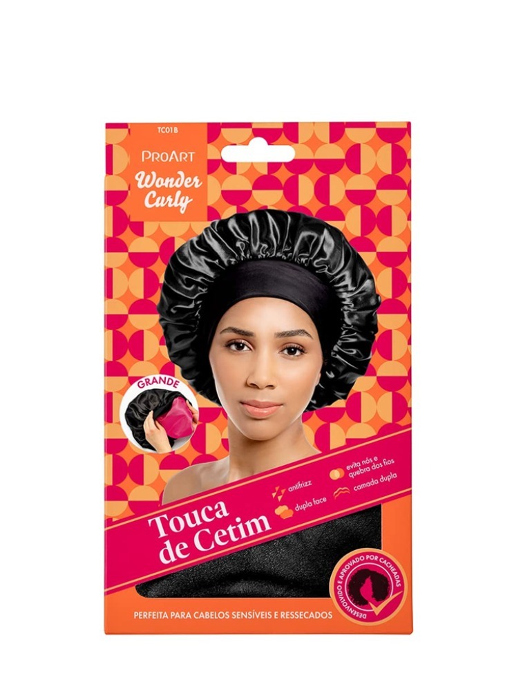 PERFEITA PARA CABELOS SENSÍVEIS E RESSECADOS A Touca de Cetim Premium Wonder Curly evita o frizz, não absorve a umidade natural dos fios, sua superfície lisa reduz o atrito preservando a cutícula dos fios ajudando a manter os cabelos mais saudáveis e hidratados, desliza com facilidade nos fios evitando quebra e nós, ajuda no day after, é versátil, simples, eficiente e indispensável para rotina de cuidados capilares.