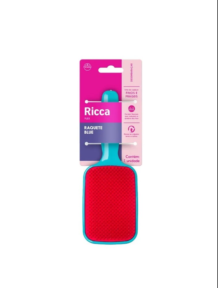 A escova Raquete Flex Ricca tem cerdas flexíveis em duas camadas de diferentes tamanhos. As mais longas e macias são desenvolvidas para desembaraçar, remover nós e reduzir a quebra dos fios, já as curtas alinham as madeixas e as deixam mais brilhantes e sem frizz.