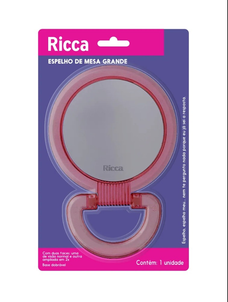 O Espelho de Mesa Ricca é um modelo super versátil! Possui dois espelhos, um com relfexo normal e outro com ampliação em 2x e uma base dobrável que pode ser utilizada como apoio para deixá-lo em pé ou para pendurá-lo na parede.
