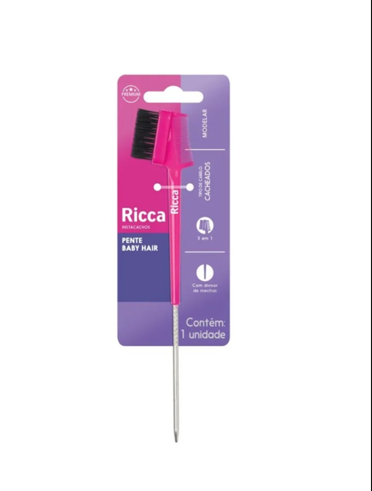 O Pente de Baby Hair Ricca Insta Cachos 3 em 1 é a solução prática para modelar e alinhar os baby hairs com facilidade. Possui cerdas grossas para um efeito uniforme, mini pente ideal para definição e estilização, além de um cabo de metal perfeito para separar mechas. Com design ergonômico e antideslizante, é um acessório indispensável para um acabamento impecável.