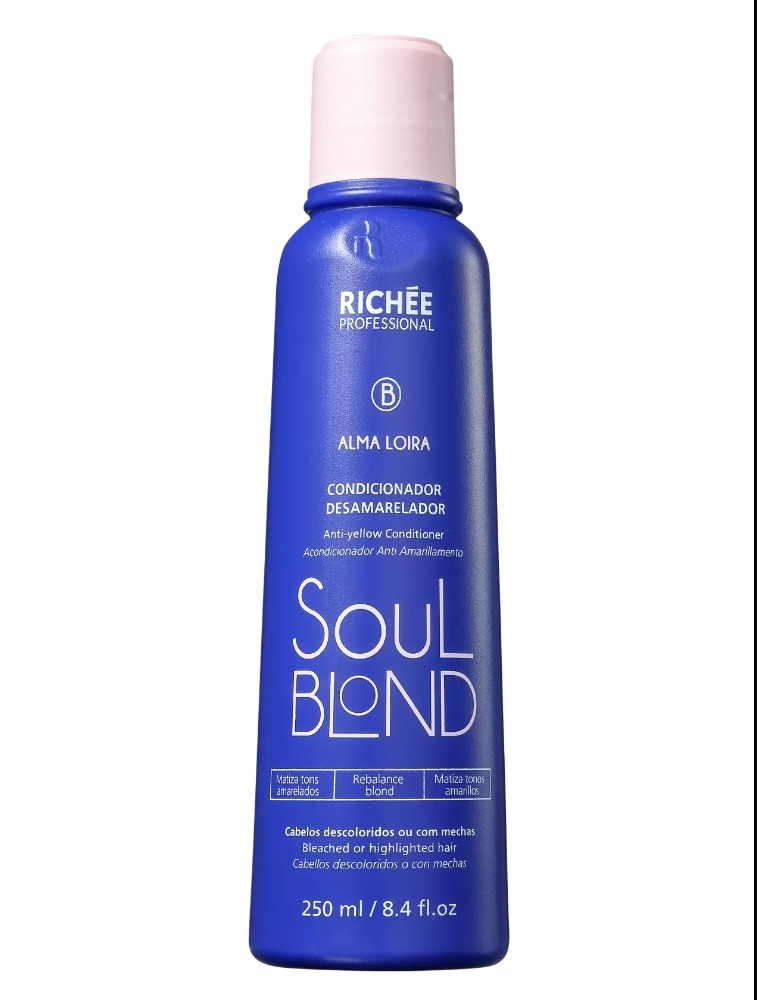 Condicionador desamarelador para cabelos loiros ou com luzes. Richée Professional Soul Blond Condicionador elimina o tom amarelado, hidrata e dá maciez.