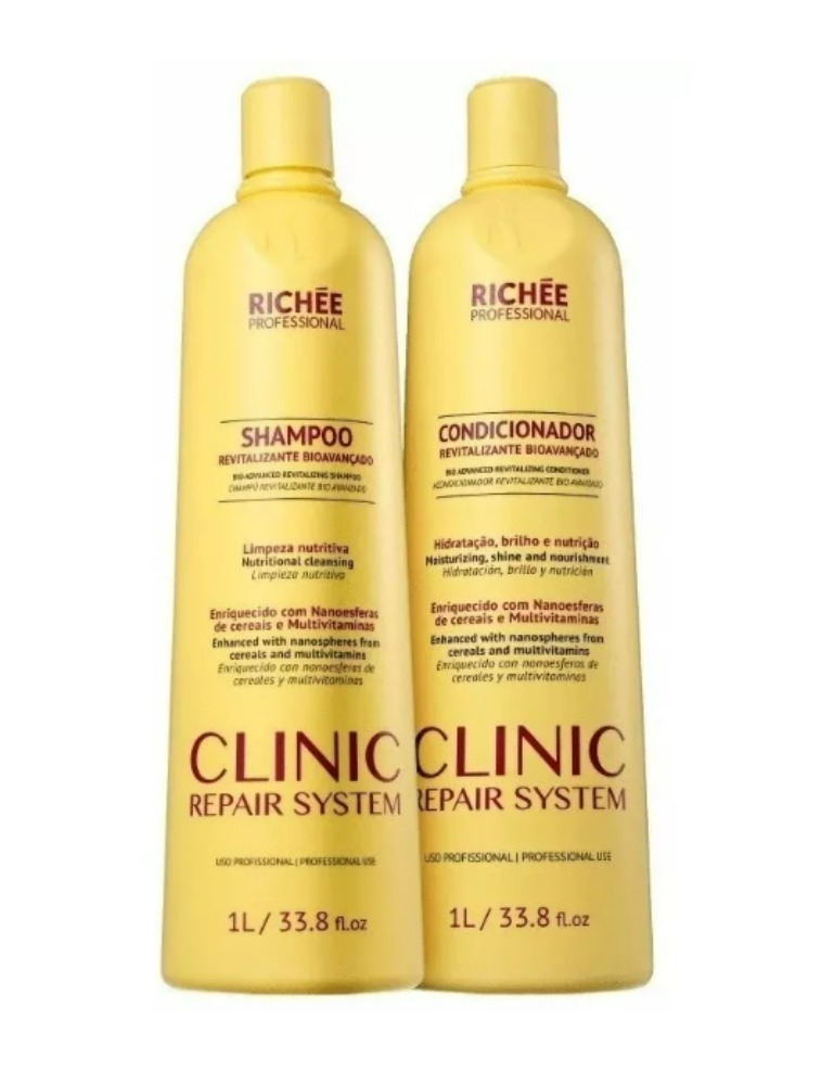 Kit para todos os tipos de cabelo em tamanho profissional. Kit Richée Professional Clinic Repair System Cuidado de Salão oferece hidratação intensiva que resgata a luminosidade e a maciez dos fios.
